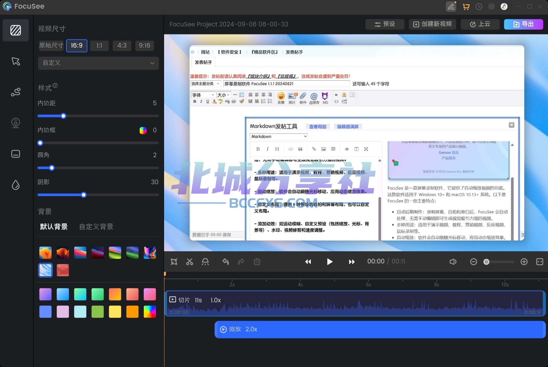 FocuSee 是一款屏幕录制软件,它提供了自动缩放视频的功能。这款软件适用于 Windows 10+ 和 macOS 10.13+ 系统。以下是 FocuSee 的一些主要特点: